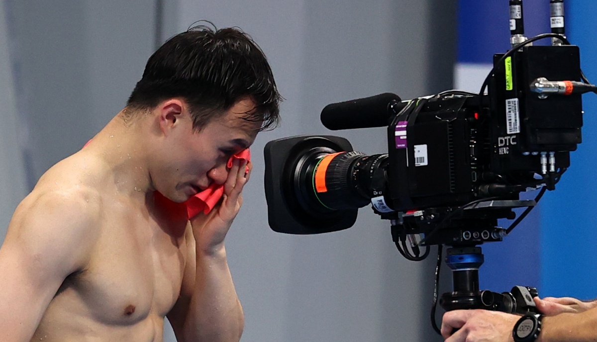 当地时间2021年8月3日,日本东京,2020东京奥运会跳水男子3米跳板决赛赛况。谢思埸落泪