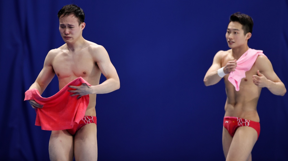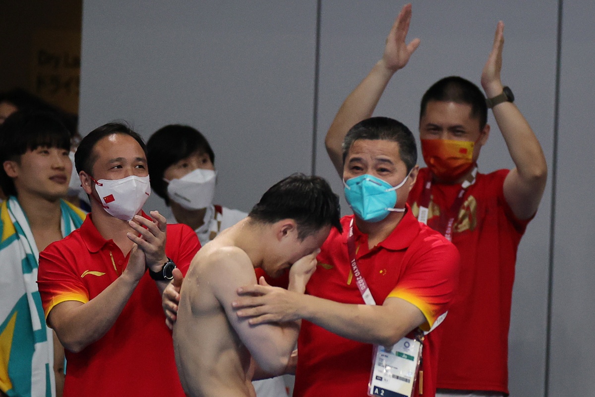 当地时间2021年8月3日,日本东京,2020东京奥运会跳水男子3米跳板决赛赛况。谢思埸赛后落泪