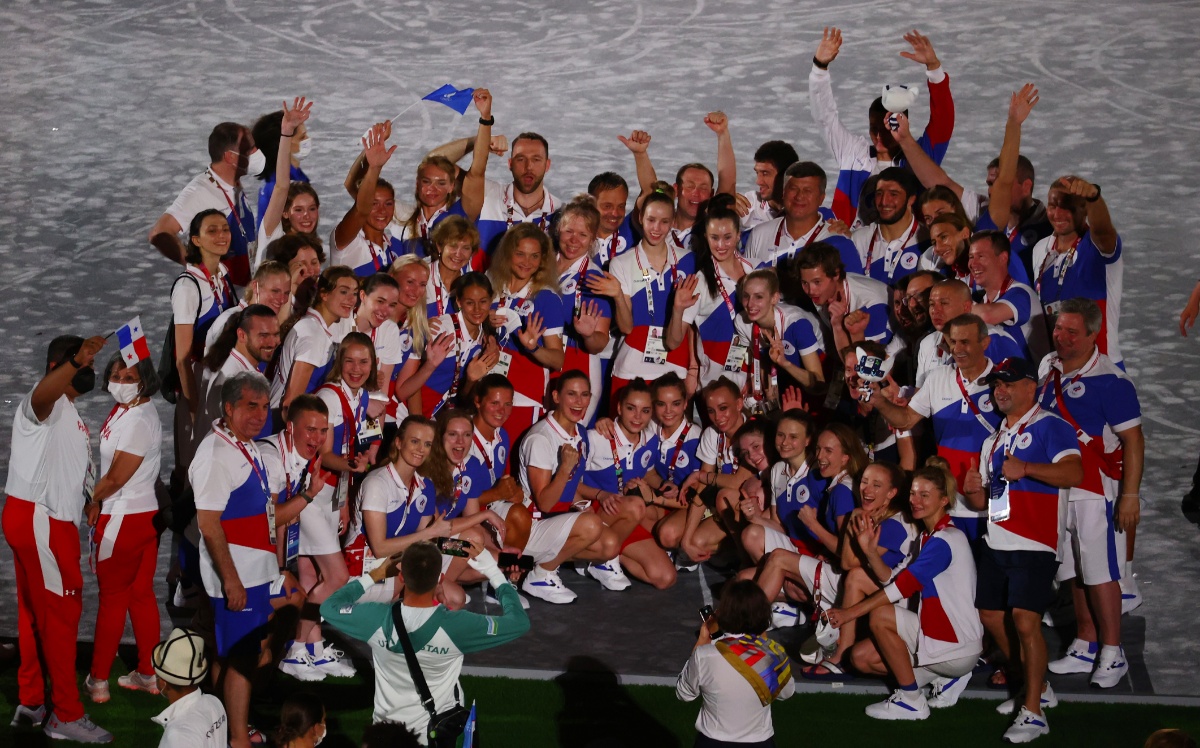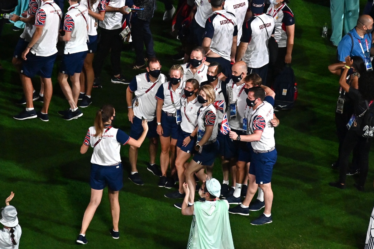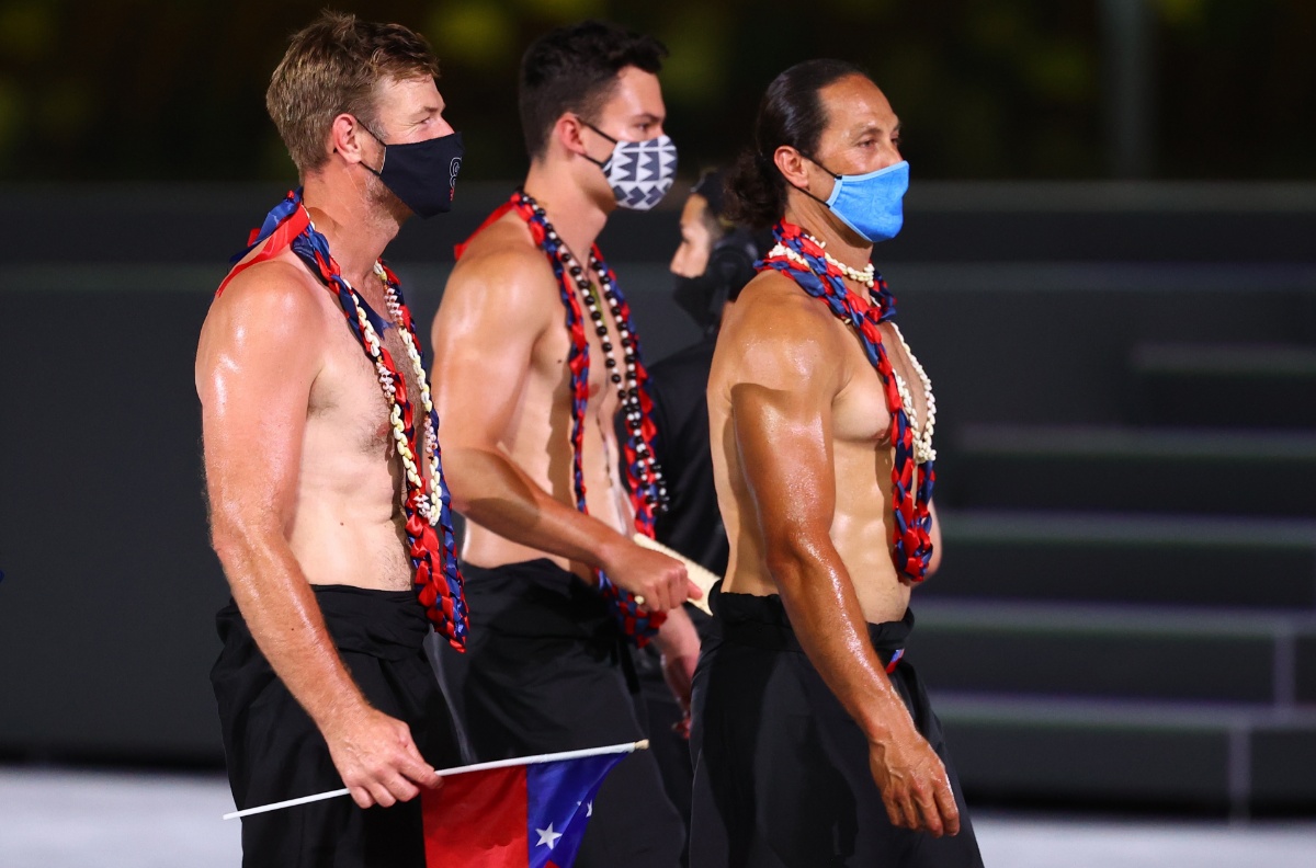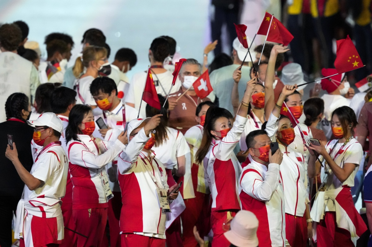 当地时间2021年8月8日,日本东京,2020东京奥运会闭幕式,中国代表团成员进场。