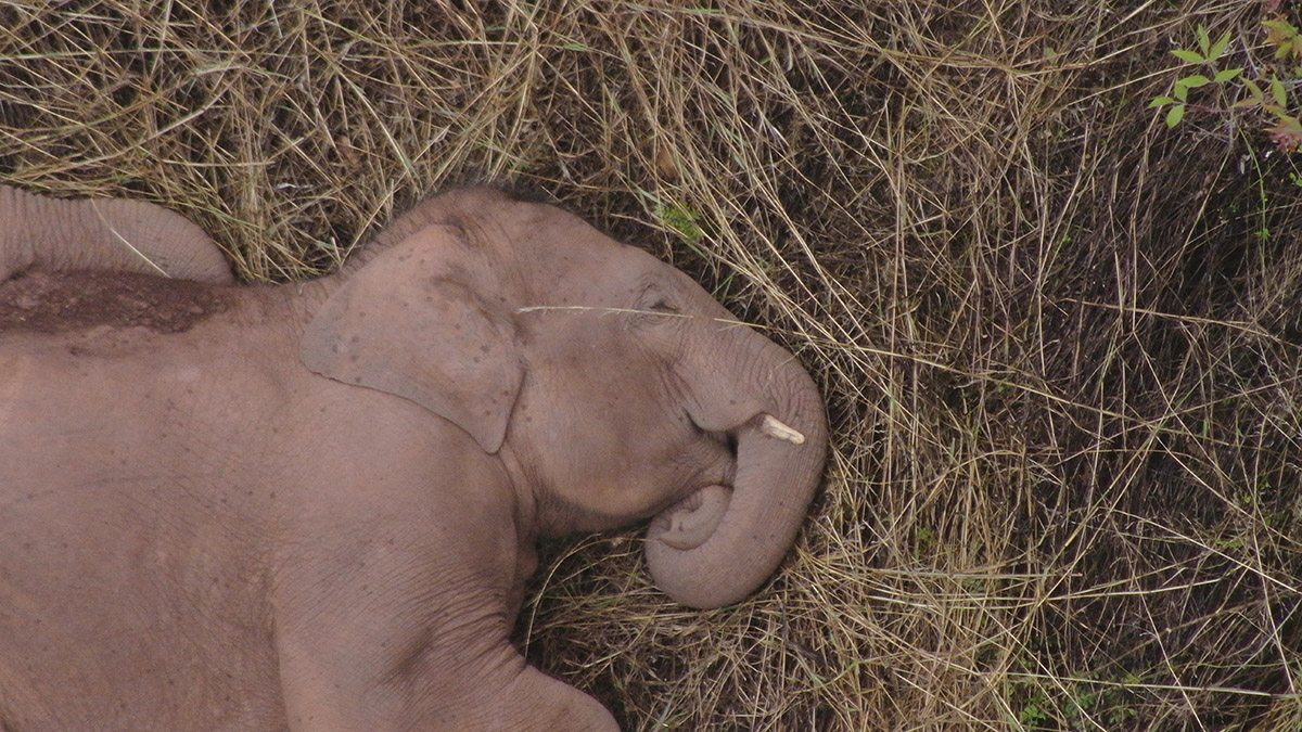 2021年6月7日,云南省森林消防总队无人机监测任务分队监测显示,亚洲象群在昆明市晋宁区夕阳乡赖家新村山林地里睡觉休息。(来源:云南省北迁亚洲象群安全防范工作省级指挥部)