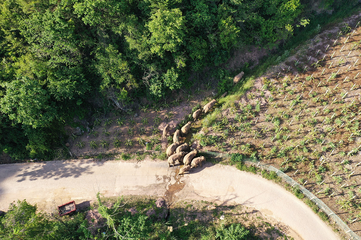 2021年5月20日,野象群北上途径云南石屏北部山区,穿越山地丛林及火龙果地。