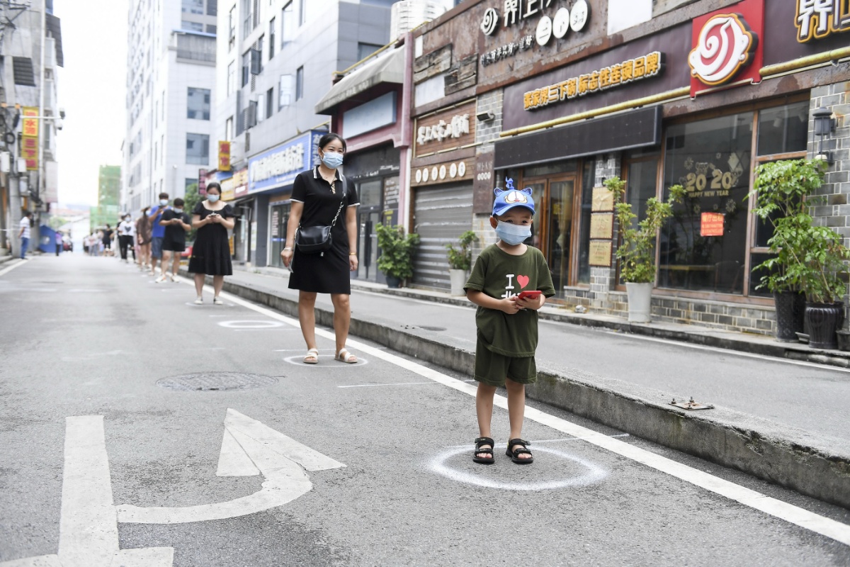 2021年8月10日,居民站在“间隔圈”内有序排队。当日,湖南张家界开启第六轮核酸检测,为保持安全距离,当地官黎坪社区工作人员在地上画上了相隔约2.5米的“间隔圈”,让前来检测的居民保持间距排队。
