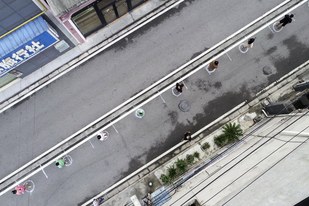 2021年8月10日,居民站在“间隔圈”内有序排队。当日,湖南张家界开启第六轮核酸检测,为保持安全距离,当地官黎坪社区工作人员在地上画上了相隔约2.5米的“间隔圈”,让前来检测的居民保持间距排队。(无人机照片)