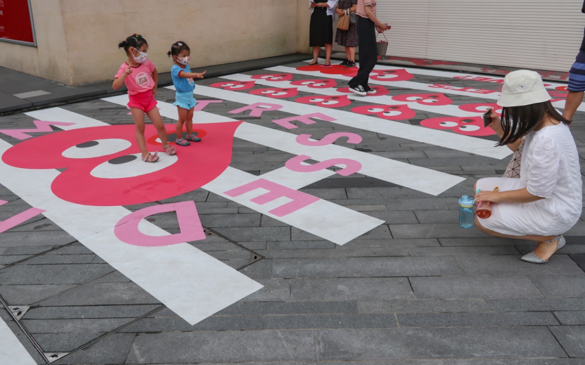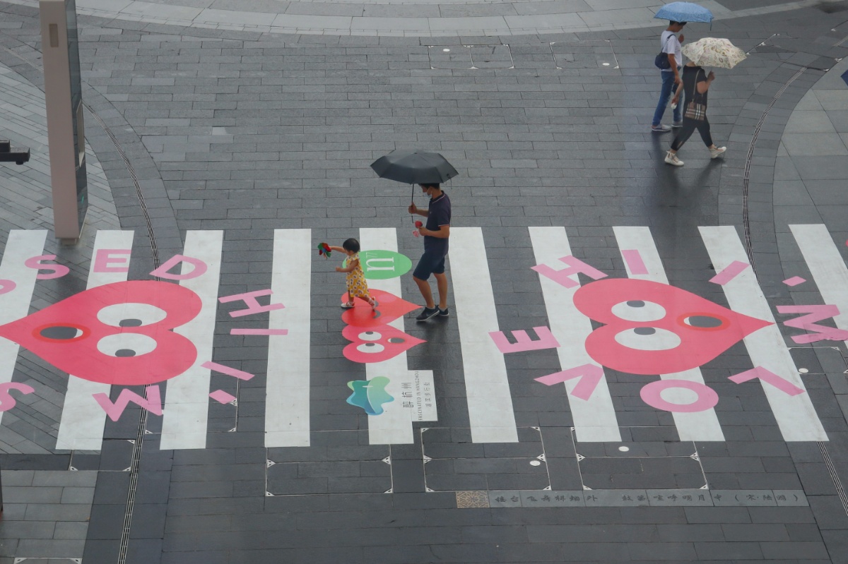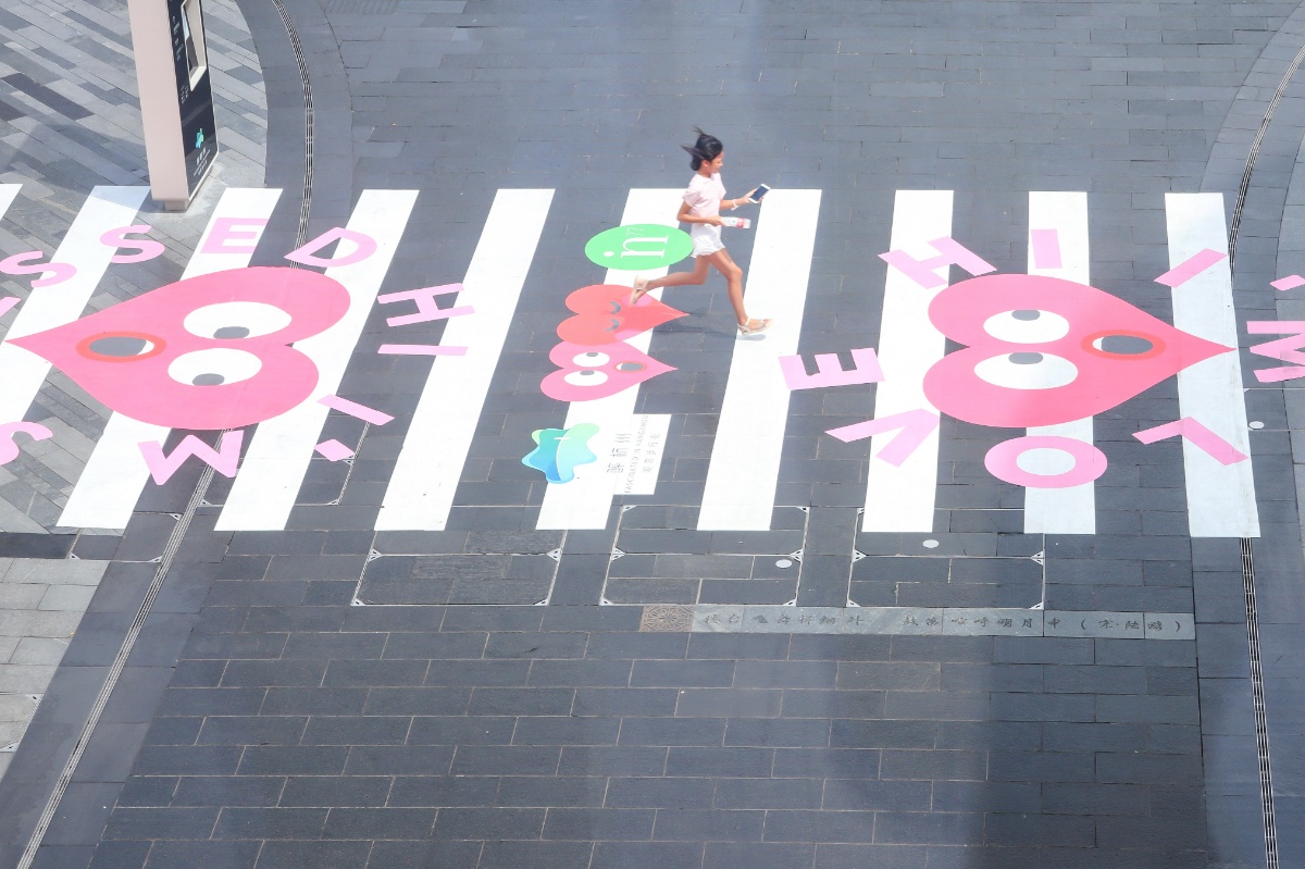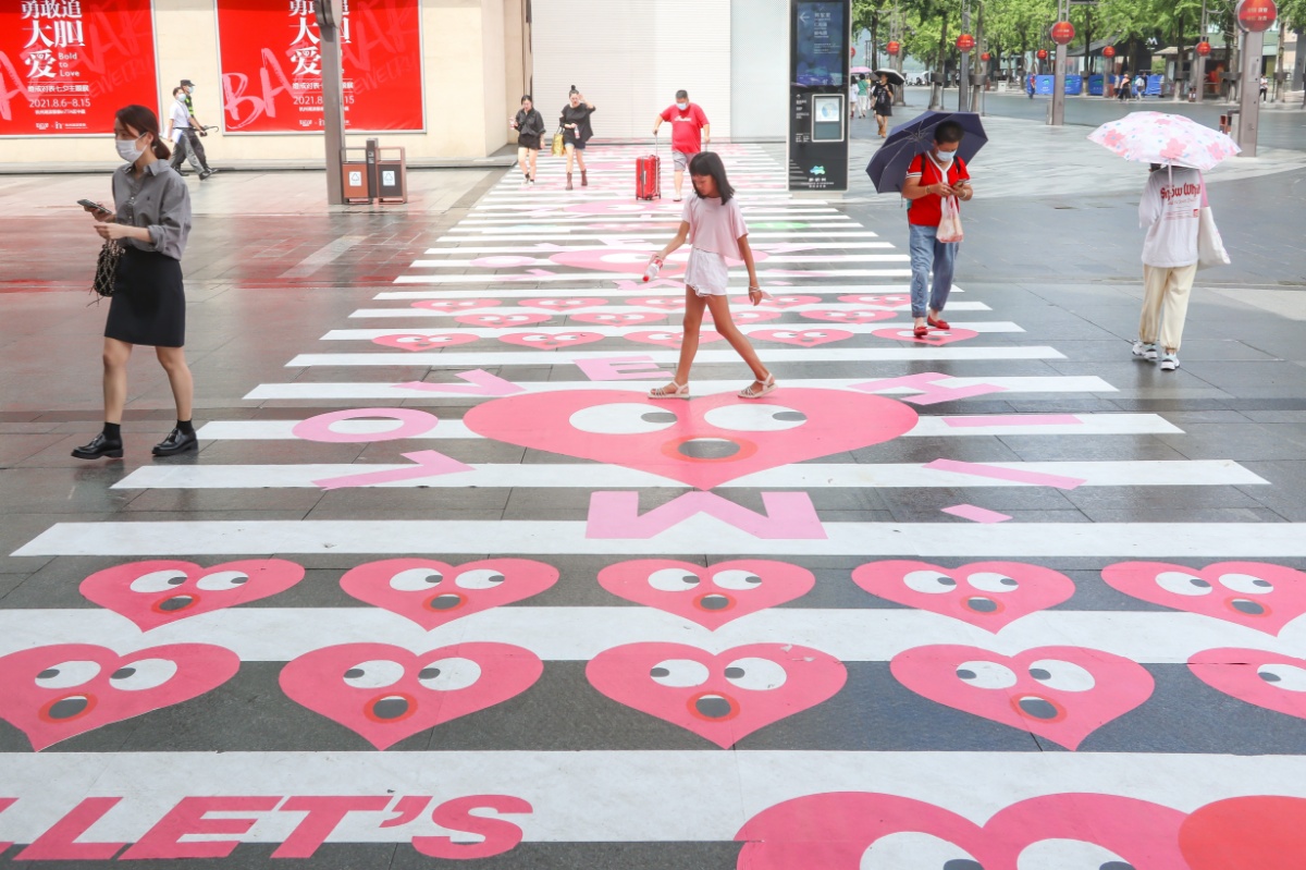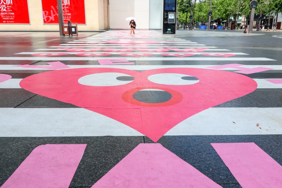 2021年8月12日,七夕将至,杭州湖滨步行街,出现了一条20米长的“爱心”斑马线,吸引了很多年轻人前来拍照打卡。