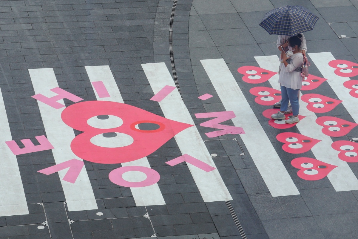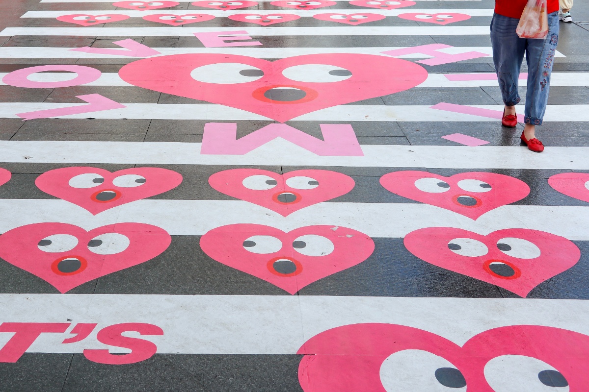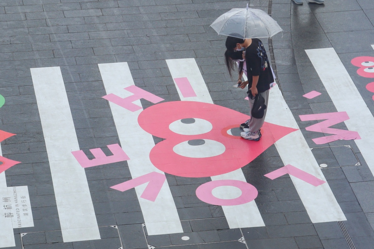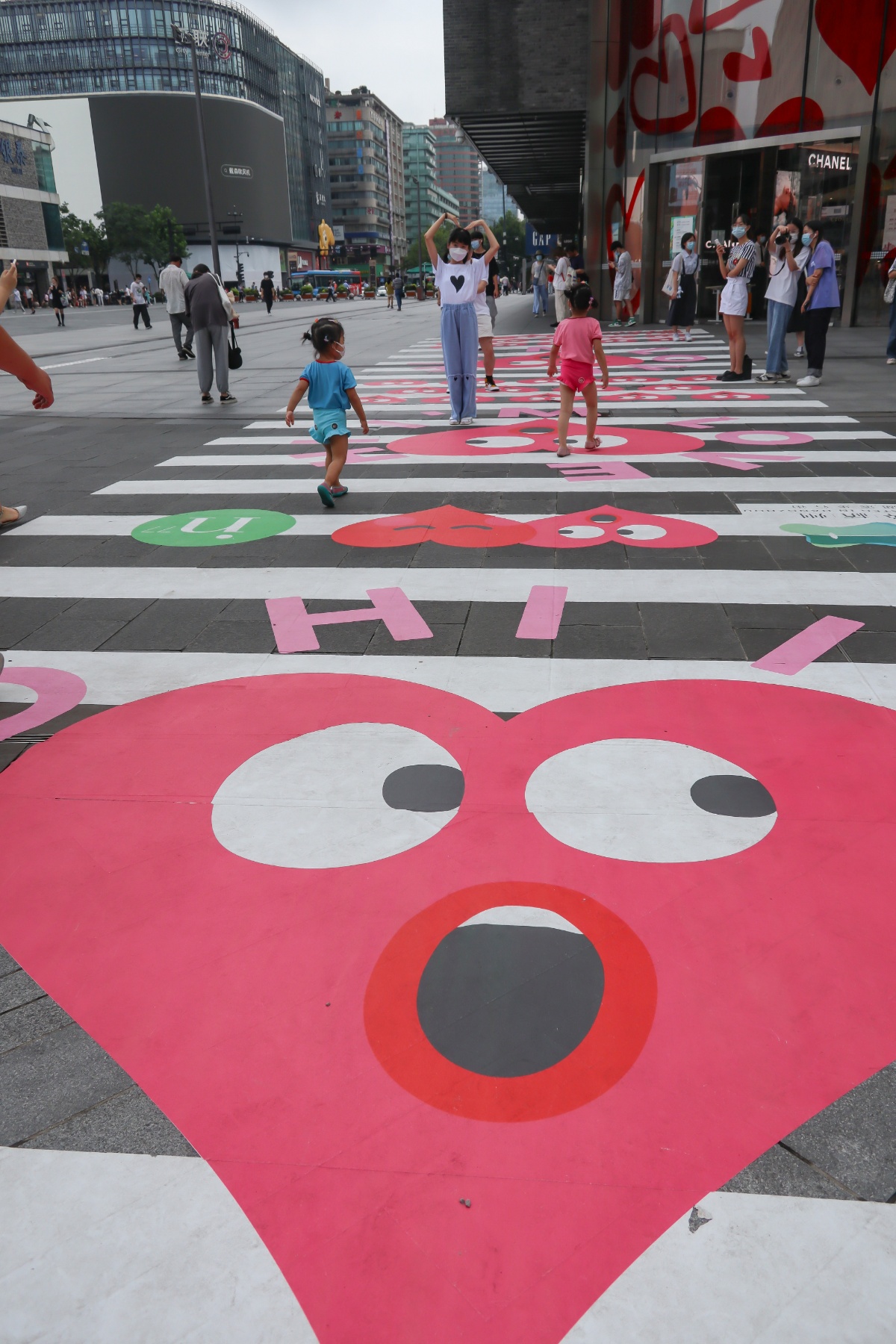 2021年8月12日,七夕将至,杭州湖滨步行街,出现了一条20米长的“爱心”斑马线,吸引了很多年轻人前来拍照打卡。