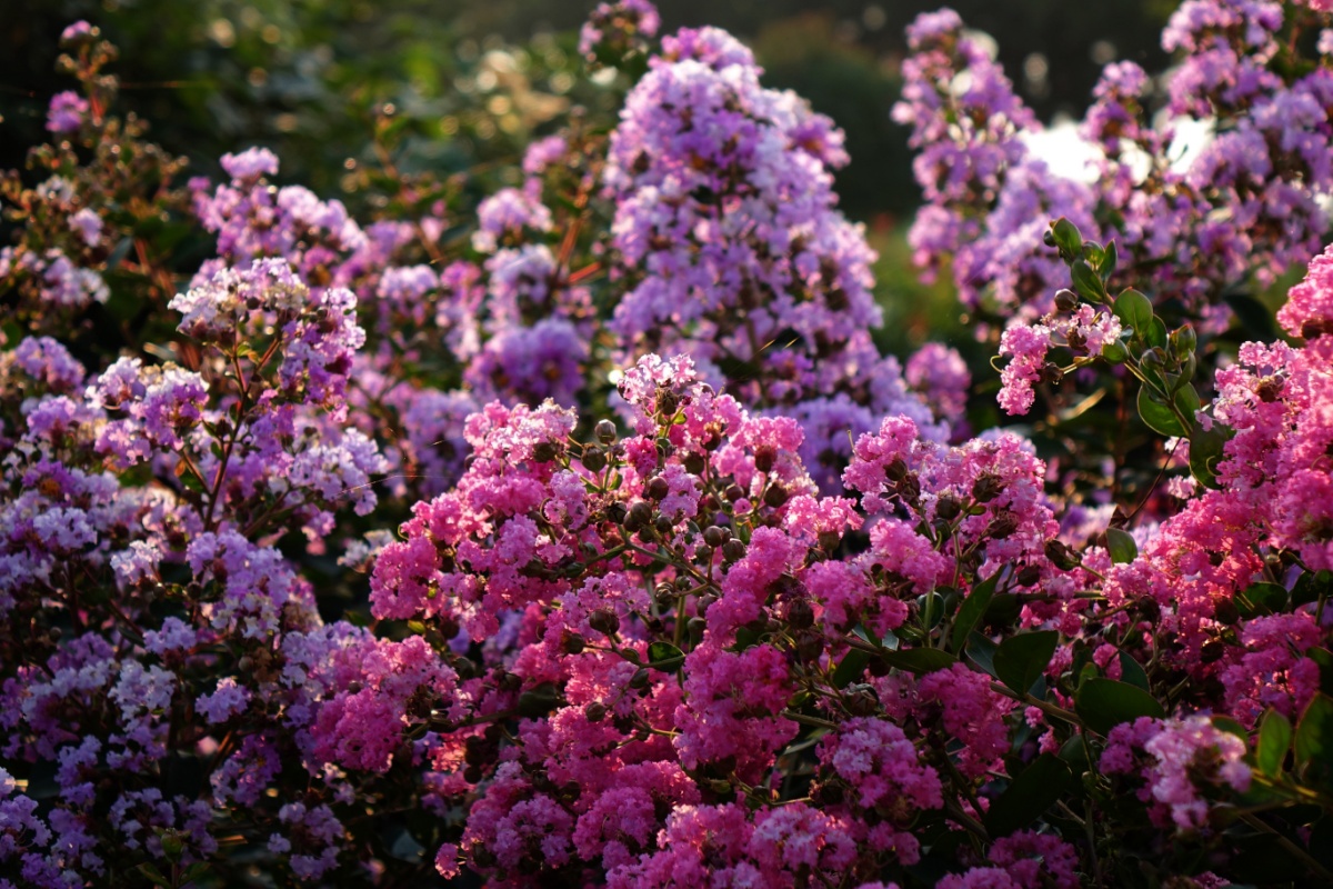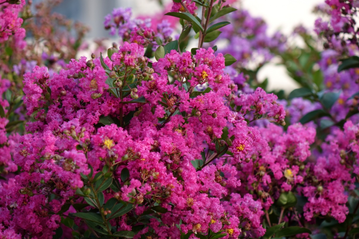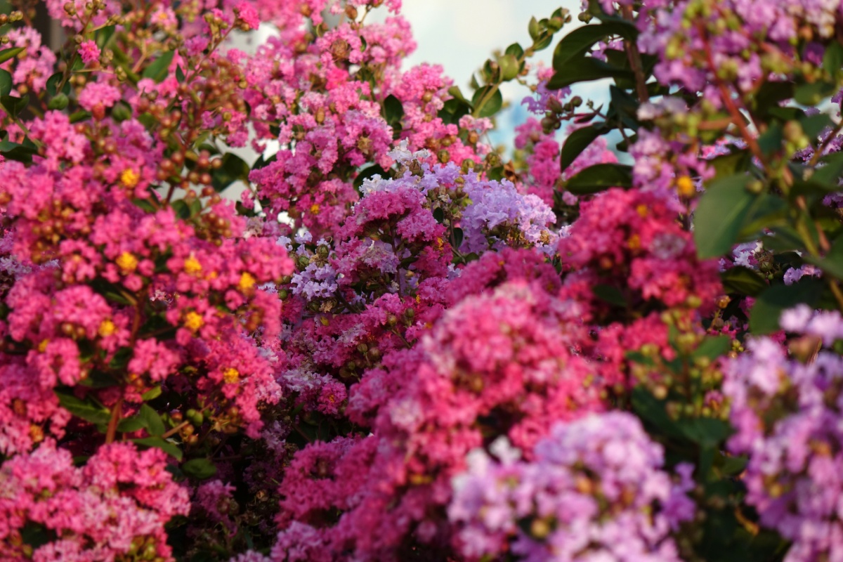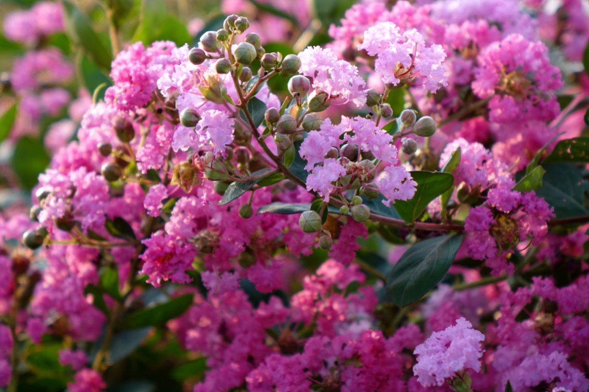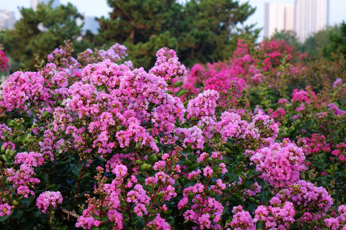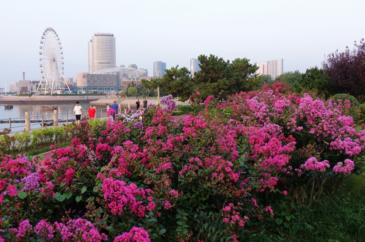 2021年8月15日,山东青岛西海岸新区唐岛湾畔,进入盛花期的紫薇恣意绽放,美不胜收,成为城市一道靓丽的风景。