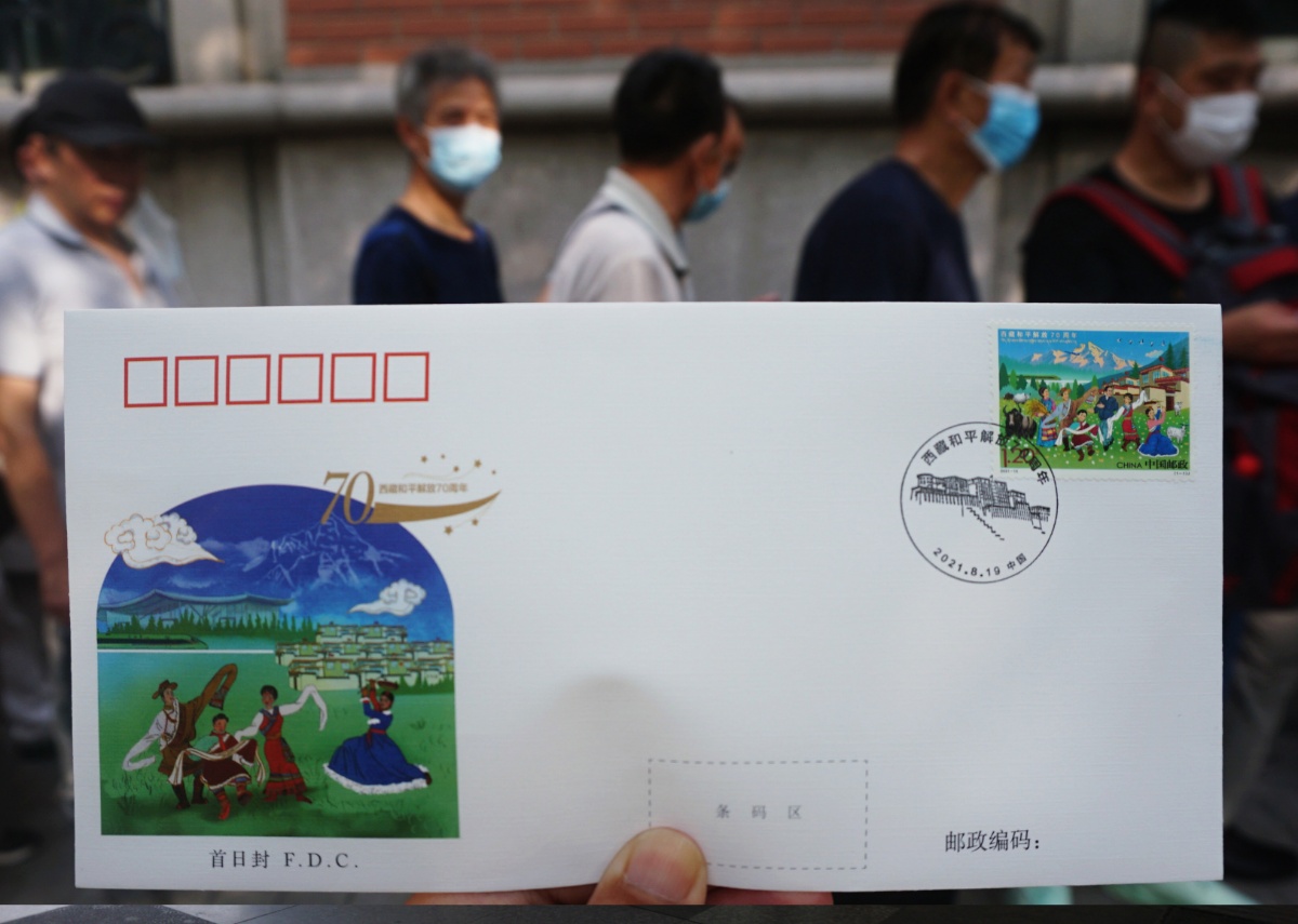2021年8月19日,浙江杭州,杭州集邮爱好者在展示《和平解放西藏70周年》纪念邮票。当日,中国邮政发行《和平解放西藏70周年》纪念邮票一套1枚,面值1.20 元。《和平解放西藏70周年》纪念邮票画面前景表现了当地群众载歌载舞、共同欢庆的场景,一旁藏民新居整洁美观、牛羊肥壮,呈现出一派欣欣向荣的景象;画面远景表现了复兴号高原动车,并衬以巍峨雪山等元素,描绘出一幅新时代西藏发展的美好画卷。