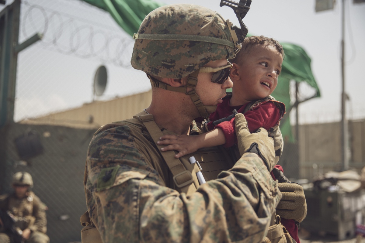 当地时间2021年8月21日,阿富汗喀布尔,美军在机场协助人员撤离阿富汗。图为一名士兵抱着萌娃。