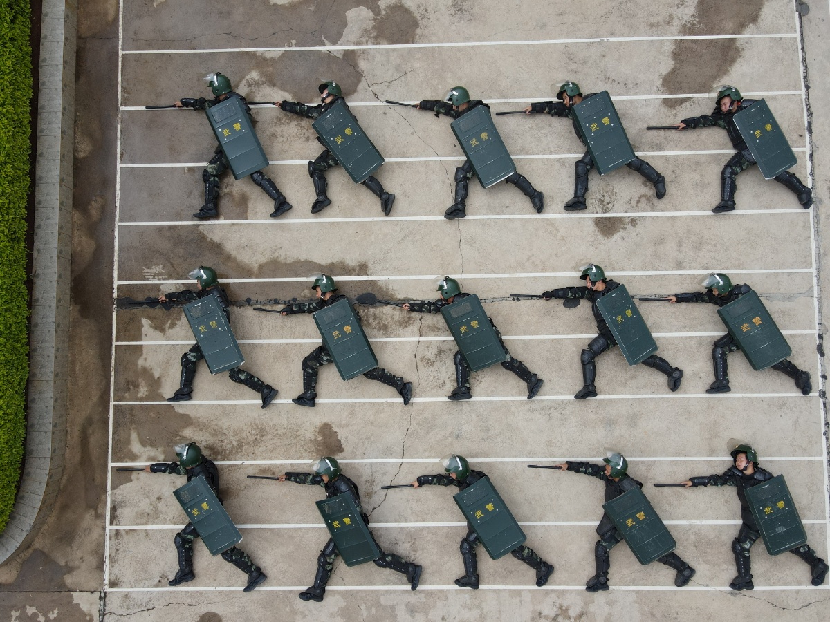 2021年8月25日,人们在欣赏拍摄蓝天白云下的北京故宫角楼。