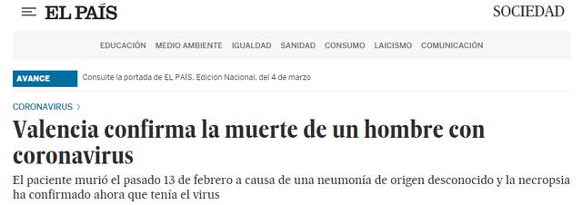 (图说:《国家报》报道标题"瓦伦西亚确认一名因新冠肺炎去世的男性,死于2月13日")