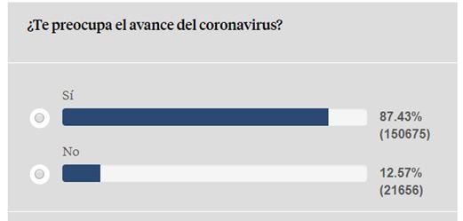 这是西班牙《先锋报》3日就"是否同意因疫情防控采取活动取消、学校停课等措施"发起的投票。截至当地时间3日12时,共有38338人参与投票,其中37716人(98.37%)表示"同意"。