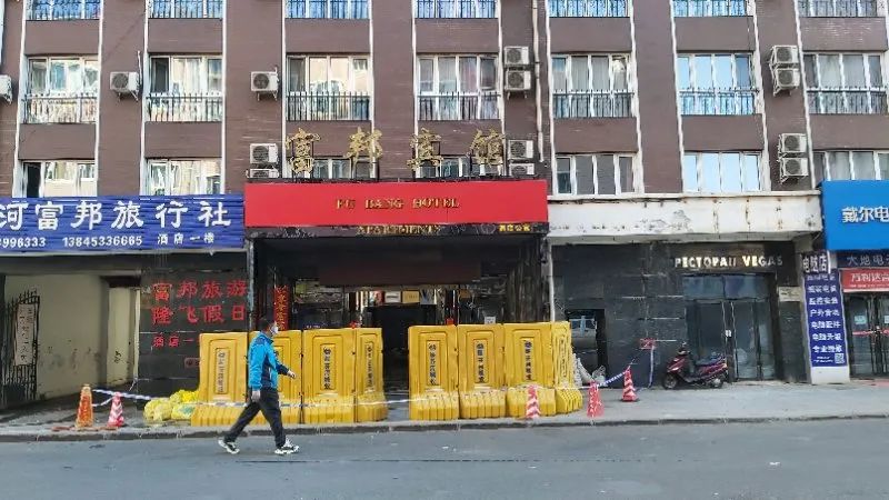 绥芬河市征用的用来隔离的宾馆之一,门口被围起,对面有警察值守。本文图片 澎湃新闻记者 段彦超