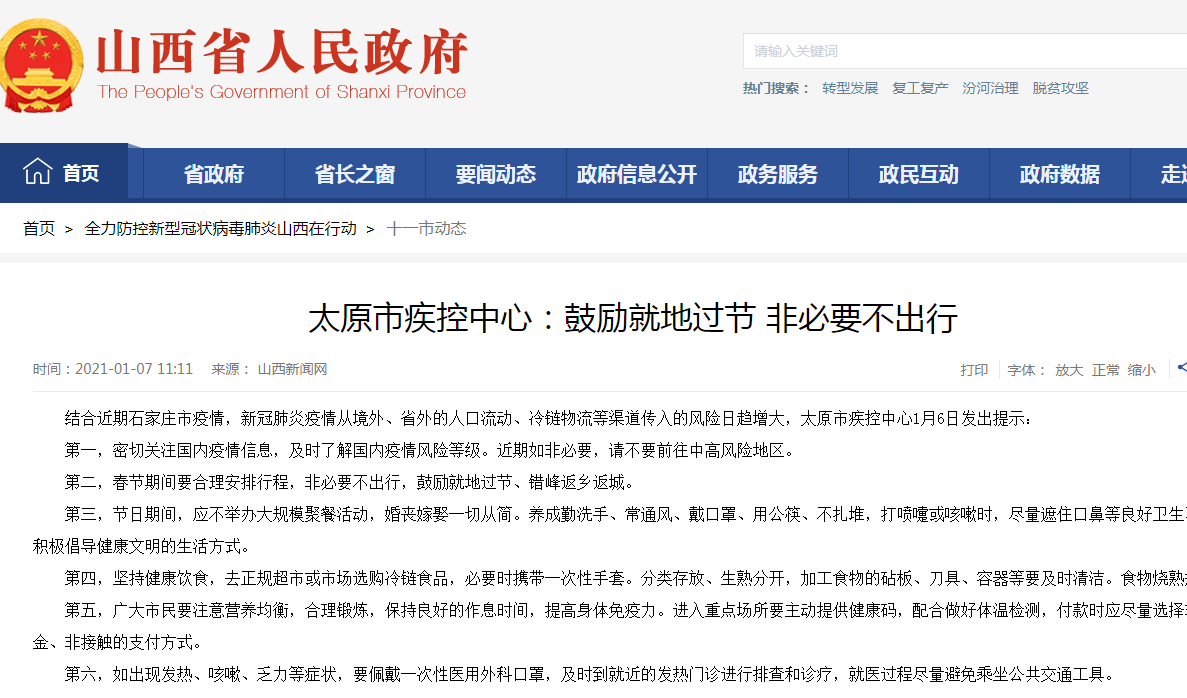 1月7日,山西省人民政府刊发太原疾控中心提示,春节期间要合理安排行程,非必要不出行,鼓励就地过节、错峰返乡返城。