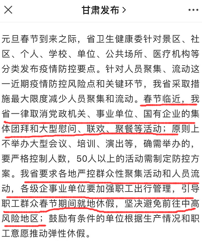 1月9日,甘肃发布元旦春节疫情防控要点:春节临近,我省一律取消党政机关、事业单位、国有企业的集体团拜和大型慰问、联欢、聚餐等活动;原则上不举办大型会议、培训、演出等,确需举办的,要严格控制人数,50人以上的活动需制定防控方案。要求各地严控群众性聚集活动和人员流动,各级企事业单位要加强职工出行管理,引导职工群众春节期间就地休假,坚决避免前往中高风险地区;鼓励有条件的单位根据生产情况和职工意愿推动弹性休假。