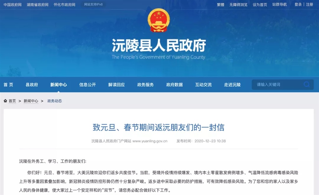 湖南省包括邵阳市、湘西州、汨罗市、娄底、怀化沅陵县等多地人民政府和疾控中心发布提示,提倡减少出行,建议在当地过节。