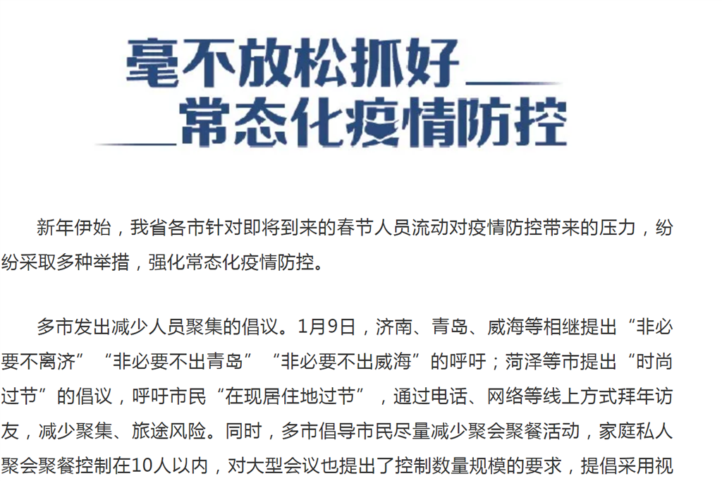 1月9日,济南、青岛、威海等相继提出“非必要不离济”“非必要不出青岛”“非必要不出威海”的呼吁;菏泽等市提出“时尚过节”的倡议,呼吁市民“在现居住地过节”,通过电话、网络等线上方式拜年访友,减少聚集、旅途风险。同时,多市倡导市民尽量减少聚会聚餐活动,家庭私人聚会聚餐控制在10人以内,对大型会议也提出了控制数量规模的要求