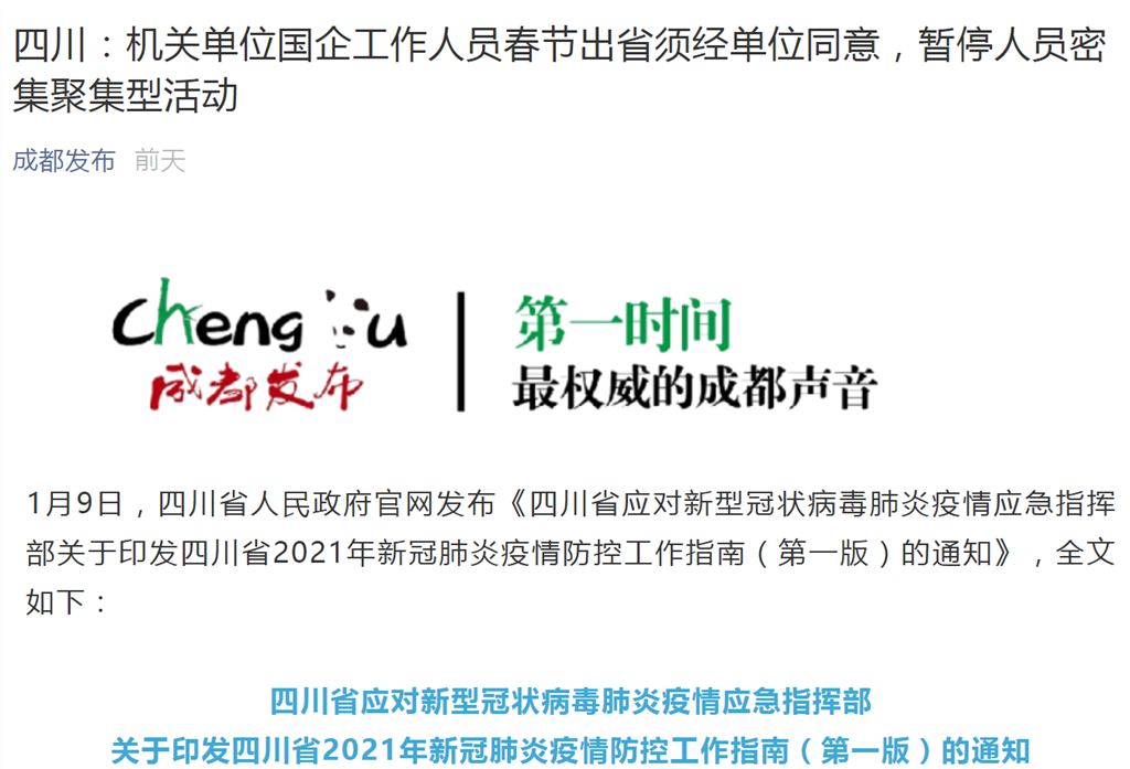 1月9日,四川政府官网发布通知提到,春节期间,各级党政机关、事业单位、国有企业工作人员带头在川过节,出省须向单位报告并经同意,可实行弹性休假。务工返乡人员、学生实行错峰返乡返岗返校,提倡条件允许情况下留在工作所在地过年,督促用人单位依法依规做好加班工资支付和调休等工作。按照属地、行业、单位管理等相结合的原则,严格执行高风险岗位人员出行前7天内核酸检测要求。