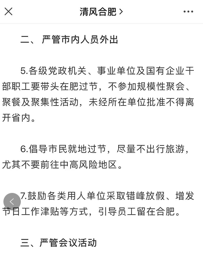 1月10日,安徽合肥市发布疫情防控1号通告,强调严管市内人员外出。各级党政机关、事业单位及国有企业干部职工要带头在肥过节,不参加规模性聚会、聚餐及聚集性活动,未经所在单位批准不得离开省内。倡导市民就地过节,尽量不出行旅游,尤其不要前往中高风险地区。除合肥外,安徽多地市也发布倡议非必要不返乡。