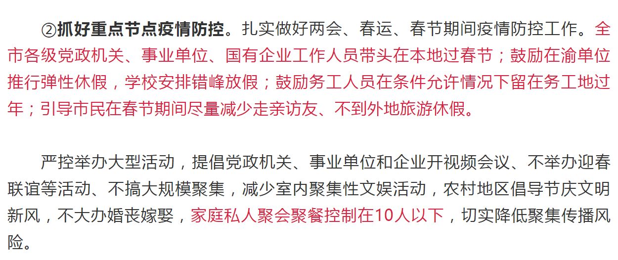 1月8日,重庆疾控发布会上通知,全市各级党政机关、事业单位、国有企业工作人员带头在本地过春节;鼓励在渝单位推行弹性休假,学校安排错峰放假;鼓励务工人员在条件允许情况下留在务工地过年;引导市民在春节期间尽量减少走亲访友、不到外地旅游休假。