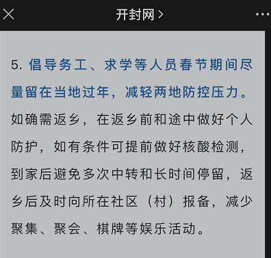 1月10日,河南省疾控中心向公众发出提醒,倡导务工、求学等人员春节期间尽量留在当地过年,减轻两地防控压力。如确需返乡,在返乡前和途中做好个人防护,如有条件可提前做好核酸检测,到家后避免多次中转和长时间停留,返乡后及时向所在社区(村)报备,减少聚集、聚会、棋牌等娱乐活动。河南开封市、新乡市、驻马店市、漯河市等地纷纷发文响应。