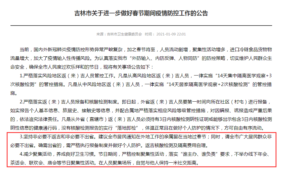 1月9日,吉林省卫健委网站公告中称,坚持非必要不返吉和非必要不出省。建议全市居民通知在外地工作的亲属留在当地过春节;同时,请全市广大居民群众非必要不出省。确需出省的,需严格执行报备制度并做好个人防护。返吉核酸检测及隔离费用自理。